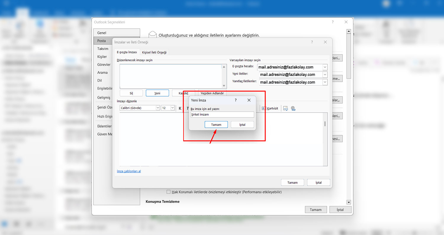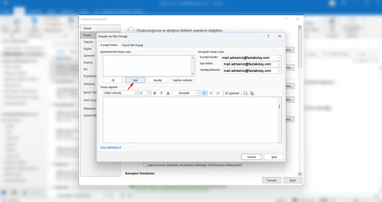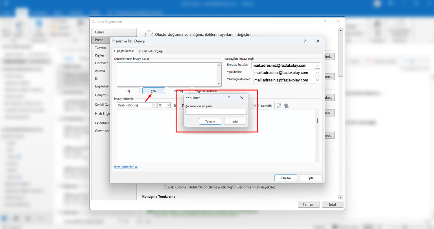 • “Yeni (New)” butonuna basarak imzanıza bir ad verin (örneğin: “Şirket İmzam”).